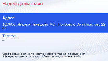 Надежда, магазин по адресу 629806, Ямало-Ненецкий АО, Ноябрьск, Энтузиастов, 22 к2 в дальнейшем Организация, размещена в следующих категориях: