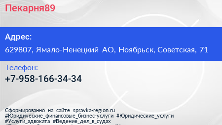 Пекарня89 по адресу 629807, Ямало-Ненецкий АО, Ноябрьск, Советская, 71 в дальнейшем Организация, размещена в следующих категориях: