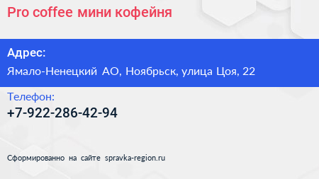 Pro.coffee, мини-кофейня по адресу Ямало-Ненецкий АО, Ноябрьск, улица Цоя, 22 в дальнейшем Организация, размещена в следующих категориях: