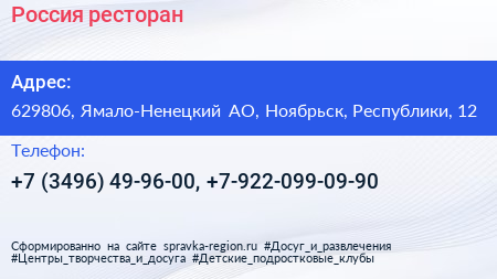 Россия, ресторан по адресу 629806, Ямало-Ненецкий АО, Ноябрьск, Республики, 12 в дальнейшем Организация, размещена в следующих категориях: