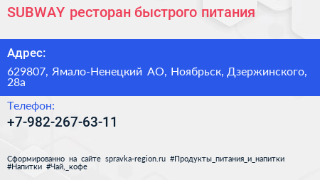 SUBWAY, ресторан быстрого питания по адресу 629807, Ямало-Ненецкий АО, Ноябрьск, Дзержинского, 28а в дальнейшем Организация, размещена в следующих категориях: