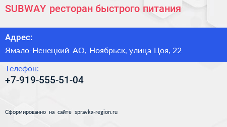 SUBWAY, ресторан быстрого питания по адресу Ямало-Ненецкий АО, Ноябрьск, улица Цоя, 22 в дальнейшем Организация, размещена в следующих категориях: