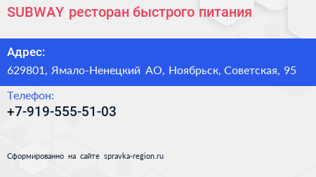 SUBWAY, ресторан быстрого питания по адресу 629801, Ямало-Ненецкий АО, Ноябрьск, Советская, 95 в дальнейшем Организация, размещена в следующих категориях:
