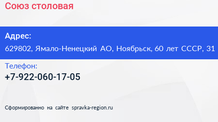 Союз, столовая по адресу 629802, Ямало-Ненецкий АО, Ноябрьск, 60 лет СССР, 31 в дальнейшем Организация, размещена в следующих категориях: