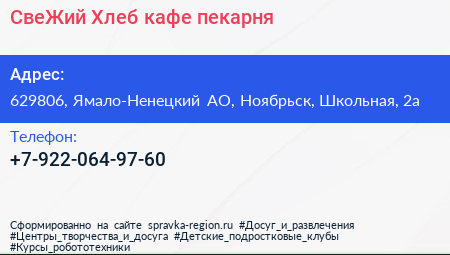 СвеЖий Хлеб, кафе-пекарня по адресу 629806, Ямало-Ненецкий АО, Ноябрьск, Школьная, 2а в дальнейшем Организация, размещена в следующих категориях: