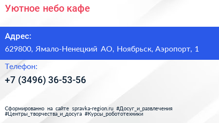 Уютное небо, кафе по адресу 629800, Ямало-Ненецкий АО, Ноябрьск, Аэропорт, 1 в дальнейшем Организация, размещена в следующих категориях: