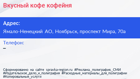 Вкусный кофе, кофейня по адресу Ямало-Ненецкий АО, Ноябрьск, проспект Мира, 70а в дальнейшем Организация, размещена в следующих категориях: