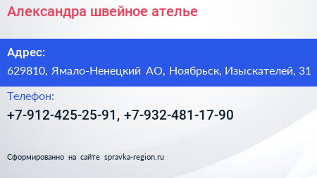 Александра, швейное ателье по адресу 629810, Ямало-Ненецкий АО, Ноябрьск, Изыскателей, 31 в дальнейшем Организация, размещена в следующих категориях: