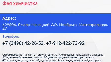 Фея, химчистка по адресу 629806, Ямало-Ненецкий АО, Ноябрьск, Магистральная, 27 в дальнейшем Организация, размещена в следующих категориях: