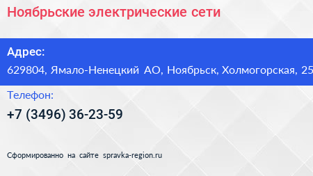 Ноябрьские электрические сети по адресу 629804, Ямало-Ненецкий АО, Ноябрьск, Холмогорская, 25 в дальнейшем Организация, размещена в следующих категориях:
