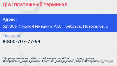 Qiwi, платежный терминал по адресу 629806, Ямало-Ненецкий АО, Ноябрьск, Новосёлов, 6 в дальнейшем Организация, размещена в следующих категориях:
