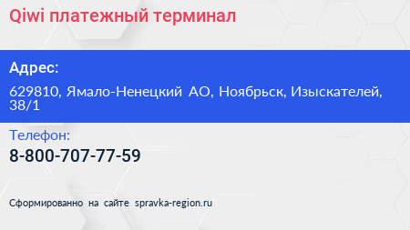 Qiwi, платежный терминал по адресу 629810, Ямало-Ненецкий АО, Ноябрьск, Изыскателей, 38/1 в дальнейшем Организация, размещена в следующих категориях: