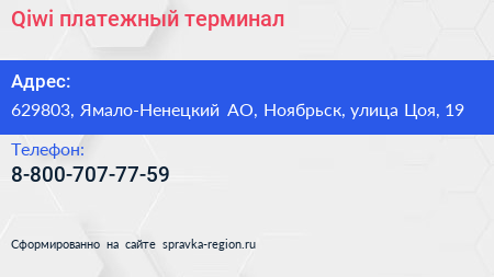 Qiwi, платежный терминал по адресу 629803, Ямало-Ненецкий АО, Ноябрьск, улица Цоя, 19 в дальнейшем Организация, размещена в следующих категориях: