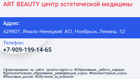 ART&BEAUTY, центр эстетической медицины по адресу 629807, Ямало-Ненецкий АО, Ноябрьск, Ленина, 52 в дальнейшем Организация, размещена в следующих категориях: