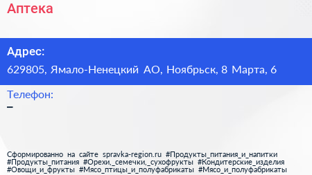 Аптека по адресу 629805, Ямало-Ненецкий АО, Ноябрьск, 8 Марта, 6 в дальнейшем Организация, размещена в следующих категориях: