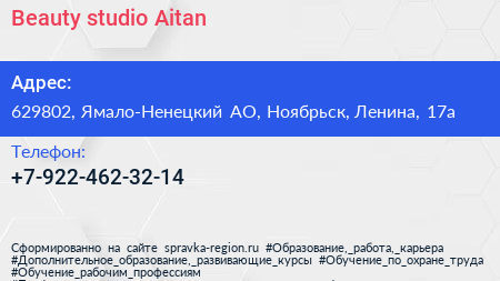 Beauty studio Aitan по адресу 629802, Ямало-Ненецкий АО, Ноябрьск, Ленина, 17а в дальнейшем Организация, размещена в следующих категориях: