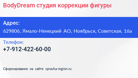 BodyDream, студия коррекции фигуры по адресу 629806, Ямало-Ненецкий АО, Ноябрьск, Советская, 16а в дальнейшем Организация, размещена в следующих категориях: