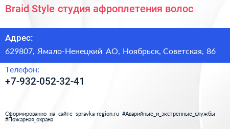 Braid Style, студия афроплетения волос по адресу 629807, Ямало-Ненецкий АО, Ноябрьск, Советская, 86 в дальнейшем Организация, размещена в следующих категориях: