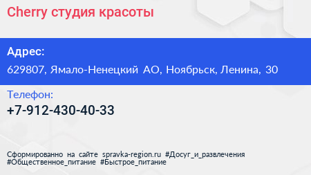 Cherry, студия красоты по адресу 629807, Ямало-Ненецкий АО, Ноябрьск, Ленина, 30 в дальнейшем Организация, размещена в следующих категориях: