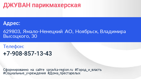 ДЖУВАН, парикмахерская по адресу 629803, Ямало-Ненецкий АО, Ноябрьск, Владимира Высоцкого, 30 в дальнейшем Организация, размещена в следующих категориях: