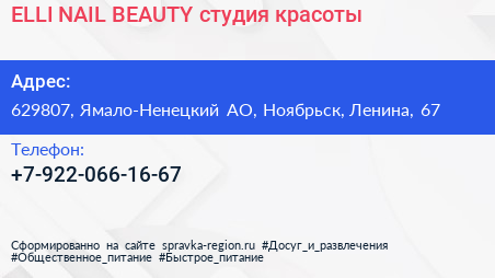ELLI NAIL & BEAUTY, студия красоты по адресу 629807, Ямало-Ненецкий АО, Ноябрьск, Ленина, 67 в дальнейшем Организация, размещена в следующих категориях: