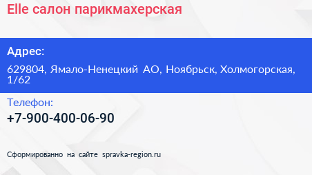 Elle, салон-парикмахерская по адресу 629804, Ямало-Ненецкий АО, Ноябрьск, Холмогорская, 1/62 в дальнейшем Организация, размещена в следующих категориях: