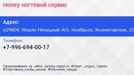 Honey, ногтевой сервис по адресу 629804, Ямало-Ненецкий АО, Ноябрьск, Холмогорская, 21 в дальнейшем Организация, размещена в следующих категориях: