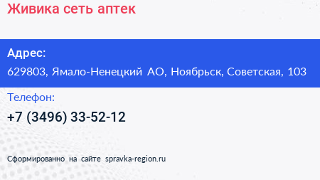 Живика, сеть аптек по адресу 629803, Ямало-Ненецкий АО, Ноябрьск, Советская, 103 в дальнейшем Организация, размещена в следующих категориях: