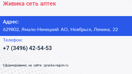 Живика, сеть аптек по адресу 629802, Ямало-Ненецкий АО, Ноябрьск, Ленина, 22 в дальнейшем Организация, размещена в следующих категориях: