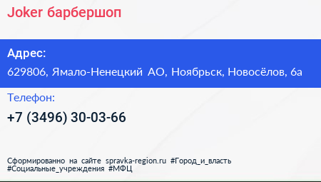 Joker, барбершоп по адресу 629806, Ямало-Ненецкий АО, Ноябрьск, Новосёлов, 6а в дальнейшем Организация, размещена в следующих категориях: