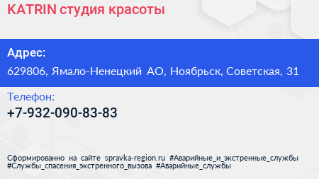 KATRIN, студия красоты по адресу 629806, Ямало-Ненецкий АО, Ноябрьск, Советская, 31 в дальнейшем Организация, размещена в следующих категориях:
