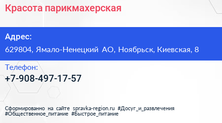 Красота, парикмахерская по адресу 629804, Ямало-Ненецкий АО, Ноябрьск, Киевская, 8 в дальнейшем Организация, размещена в следующих категориях: