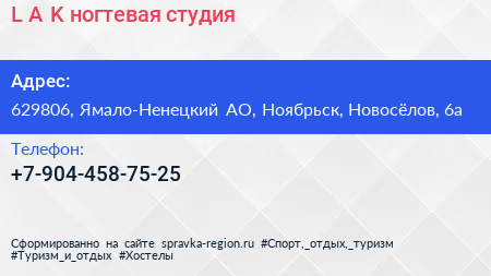 L.A.K, ногтевая студия по адресу 629806, Ямало-Ненецкий АО, Ноябрьск, Новосёлов, 6а в дальнейшем Организация, размещена в следующих категориях: