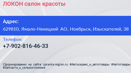 ЛОКОН, салон красоты по адресу 629810, Ямало-Ненецкий АО, Ноябрьск, Изыскателей, 38 в дальнейшем Организация, размещена в следующих категориях:
