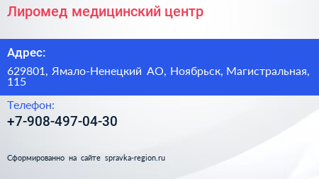 Лиромед, медицинский центр по адресу 629801, Ямало-Ненецкий АО, Ноябрьск, Магистральная, 115 в дальнейшем Организация, размещена в следующих категориях: