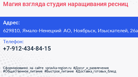 Магия взгляда, студия наращивания ресниц по адресу 629810, Ямало-Ненецкий АО, Ноябрьск, Изыскателей, 26а в дальнейшем Организация, размещена в следующих категориях: