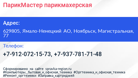 ПарикМастер, парикмахерская по адресу 629805, Ямало-Ненецкий АО, Ноябрьск, Магистральная, 77 в дальнейшем Организация, размещена в следующих категориях: