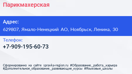 Парикмахерская по адресу 629807, Ямало-Ненецкий АО, Ноябрьск, Ленина, 30 в дальнейшем Организация, размещена в следующих категориях: