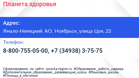 Планета здоровья по адресу Ямало-Ненецкий АО, Ноябрьск, улица Цоя, 22 в дальнейшем Организация, размещена в следующих категориях:
