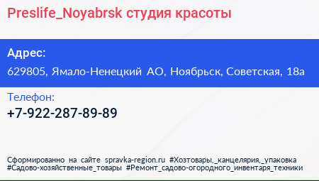 Preslife_Noyabrsk, студия красоты по адресу 629805, Ямало-Ненецкий АО, Ноябрьск, Советская, 18а в дальнейшем Организация, размещена в следующих категориях: