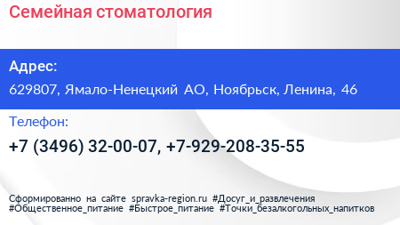 Семейная, стоматология по адресу 629807, Ямало-Ненецкий АО, Ноябрьск, Ленина, 46 в дальнейшем Организация, размещена в следующих категориях: