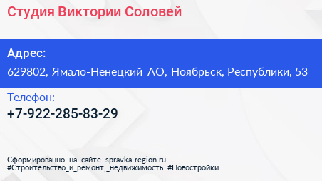 Студия Виктории Соловей по адресу 629802, Ямало-Ненецкий АО, Ноябрьск, Республики, 53 в дальнейшем Организация, размещена в следующих категориях: