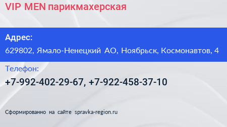 VIP MEN, парикмахерская по адресу 629802, Ямало-Ненецкий АО, Ноябрьск, Космонавтов, 4 в дальнейшем Организация, размещена в следующих категориях: