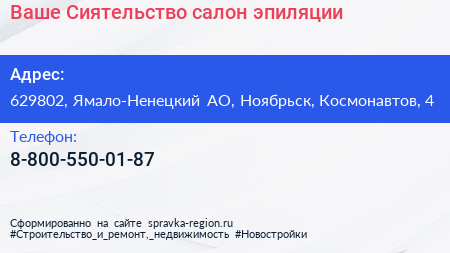 Ваше Сиятельство, салон эпиляции по адресу 629802, Ямало-Ненецкий АО, Ноябрьск, Космонавтов, 4 в дальнейшем Организация, размещена в следующих категориях: