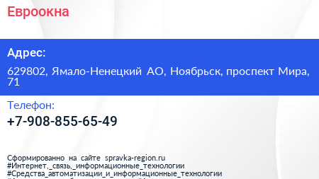 Евроокна + по адресу 629802, Ямало-Ненецкий АО, Ноябрьск, проспект Мира, 71 в дальнейшем Организация, размещена в следующих категориях: