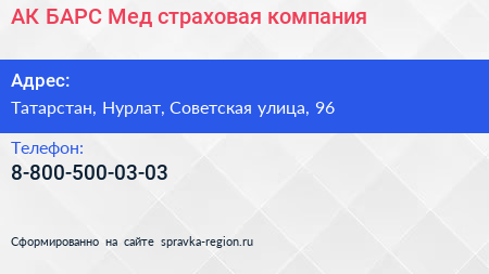 АК БАРС-Мед, страховая компания по адресу Татарстан, Нурлат, Советская улица, 96 в дальнейшем Организация, размещена в следующих категориях: