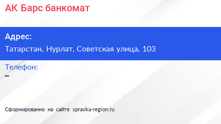 АК Барс, банкомат по адресу Татарстан, Нурлат, Советская улица, 103 в дальнейшем Организация, размещена в следующих категориях: