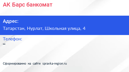 АК Барс, банкомат по адресу Татарстан, Нурлат, Школьная улица, 4 в дальнейшем Организация, размещена в следующих категориях: