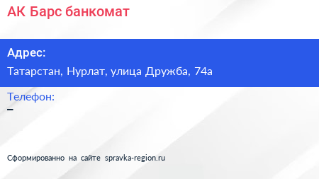 АК Барс, банкомат по адресу Татарстан, Нурлат, улица Дружба, 74а в дальнейшем Организация, размещена в следующих категориях: