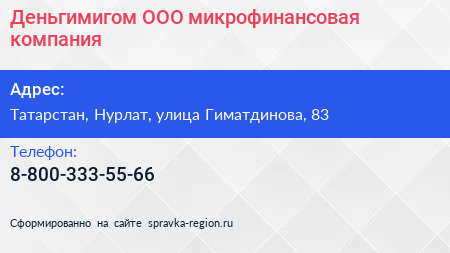 Деньгимигом, ООО, микрофинансовая компания по адресу Татарстан, Нурлат, улица Гиматдинова, 83 в дальнейшем Организация, размещена в следующих категориях:
